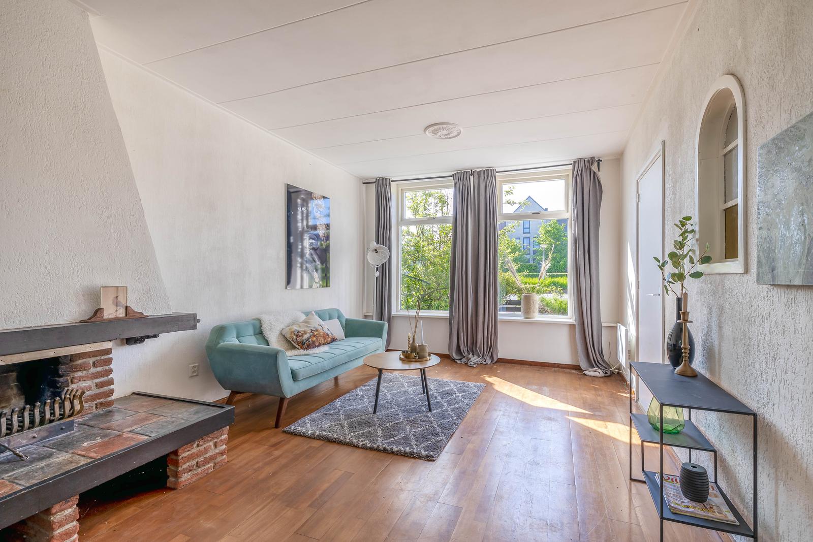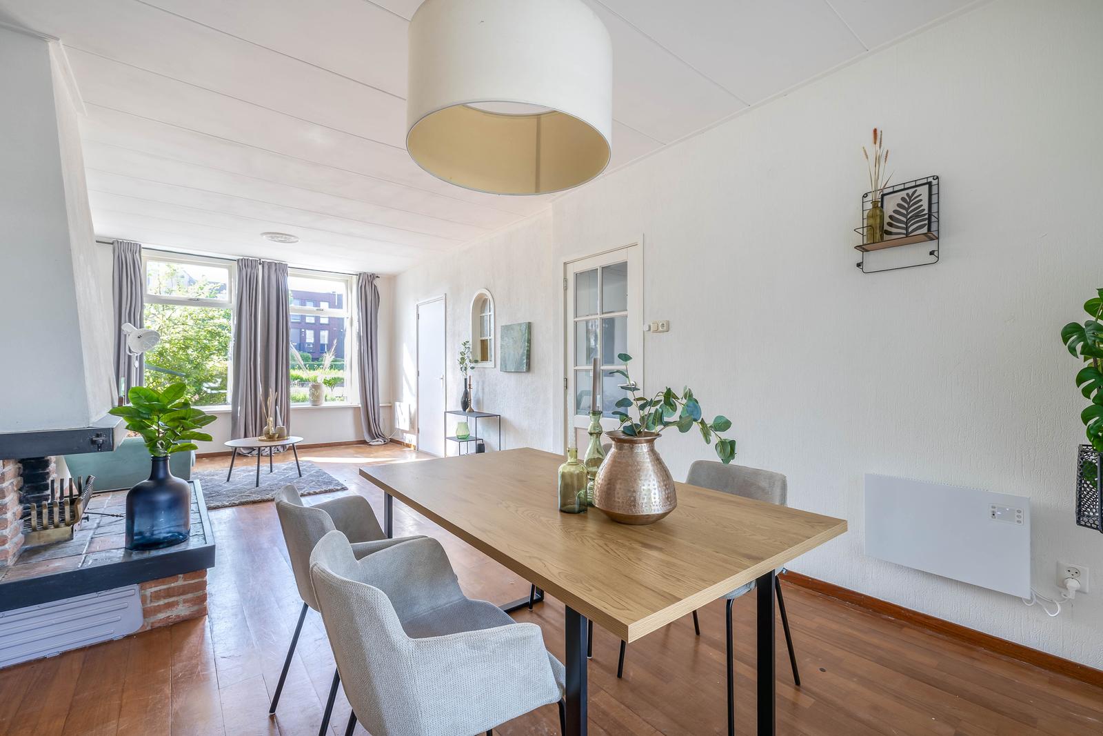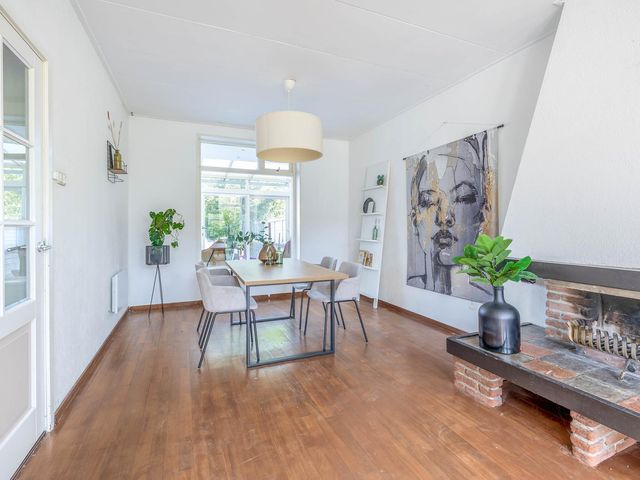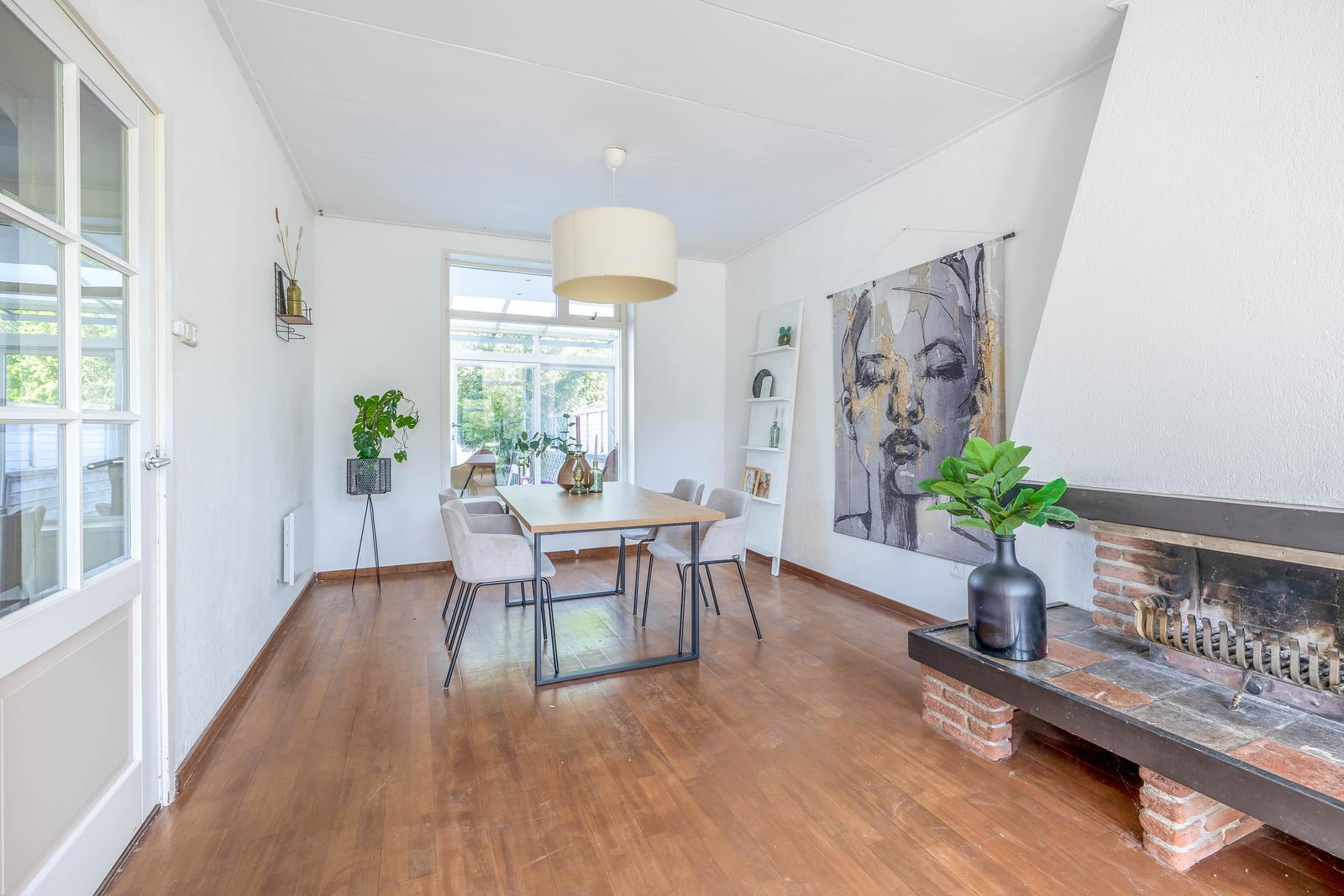 Woonkamer van mooi formaat met schouw en doorloop naar de eetkamer met aan de achterzijde de serre van 9m2 .
