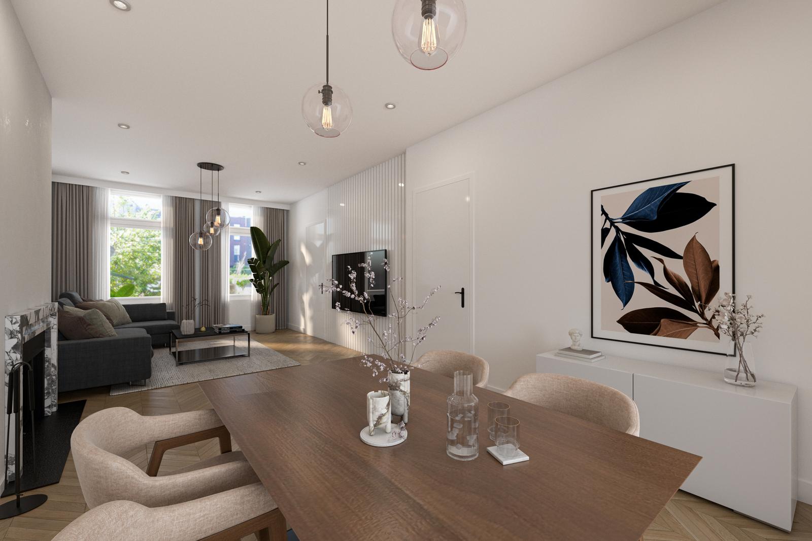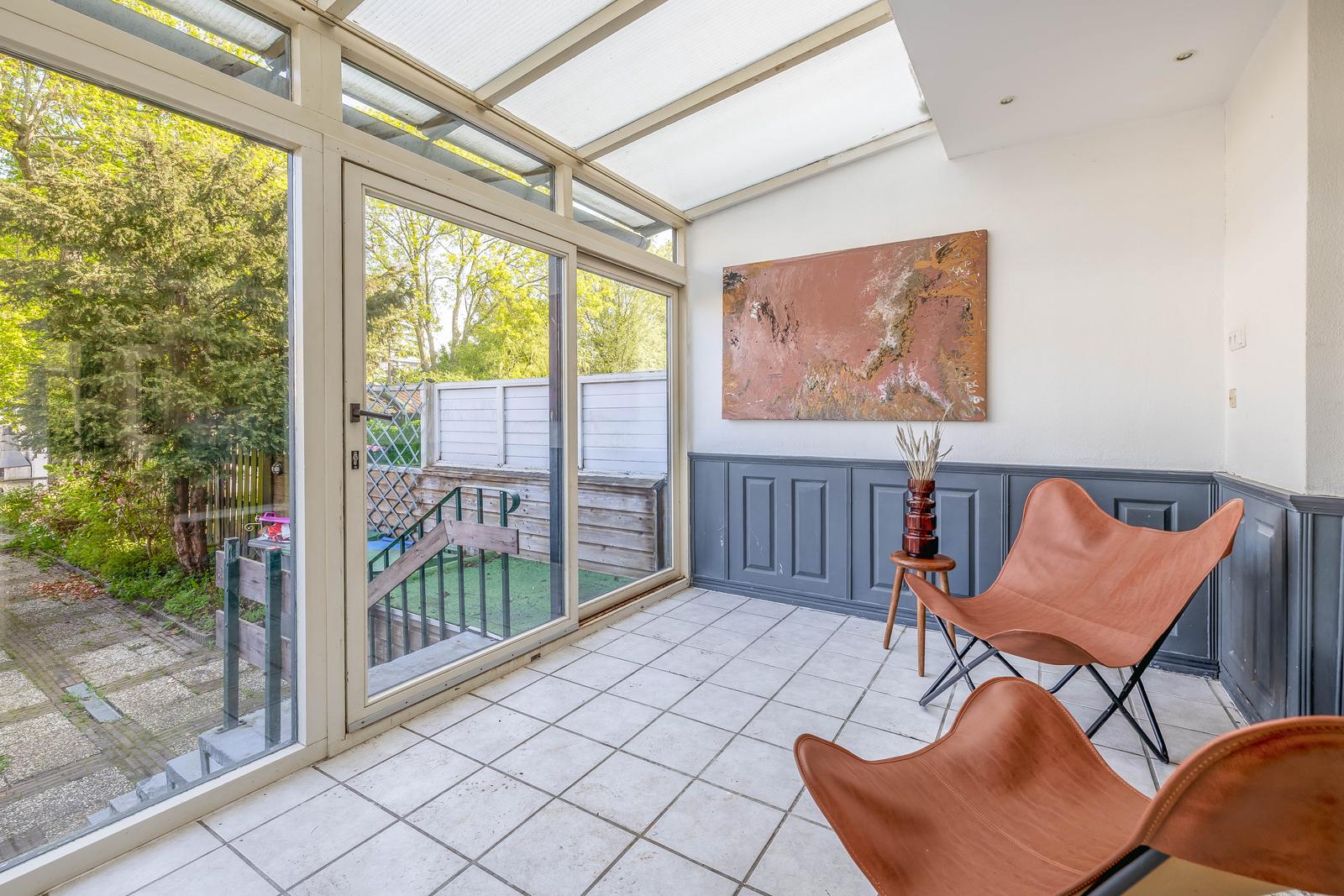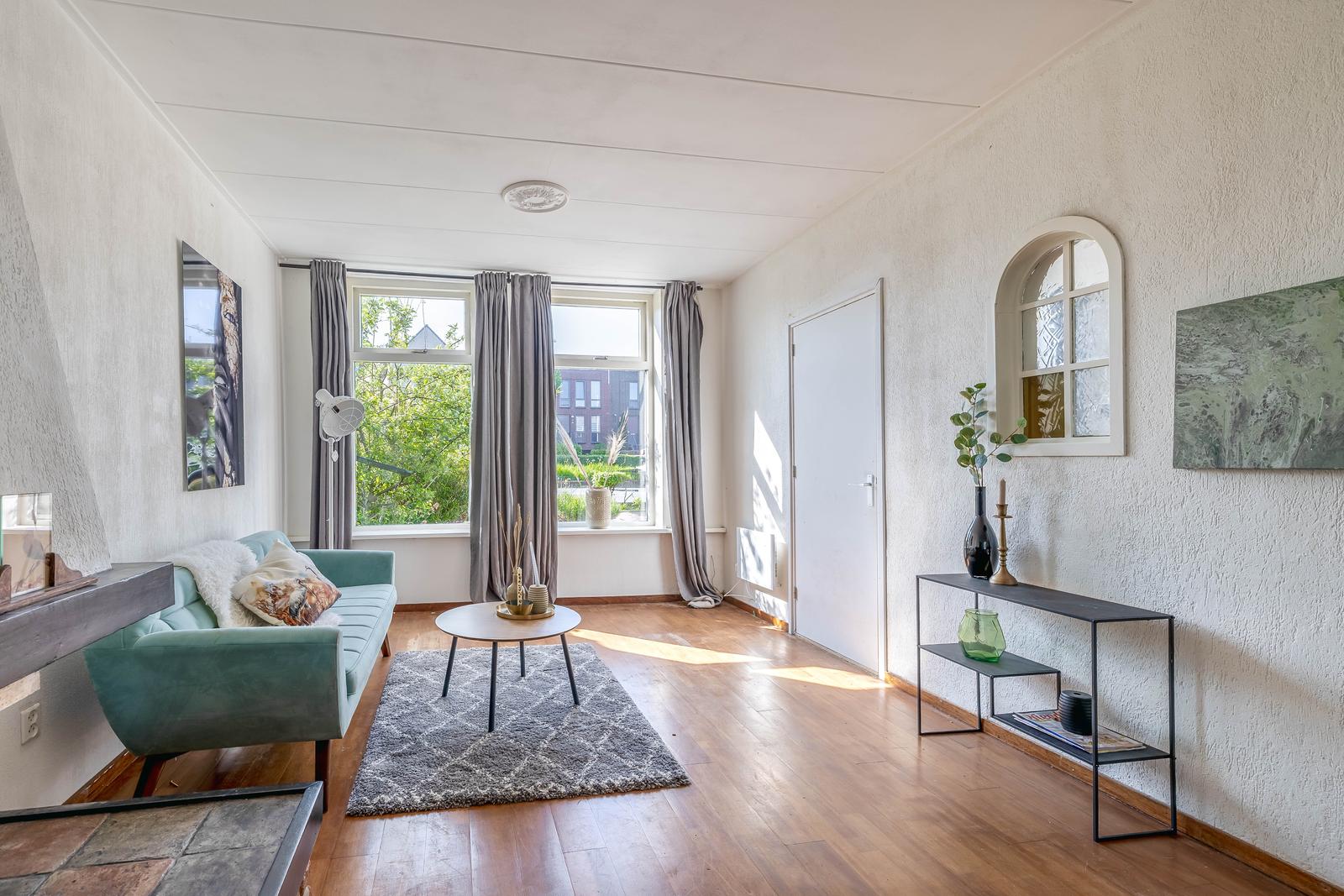 Woonkamer van mooi formaat met schouw en doorloop naar de eetkamer met aan de achterzijde de serre van 9m2 .