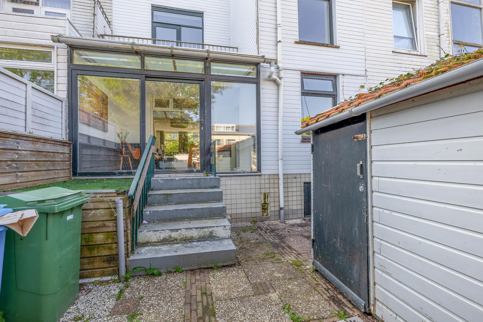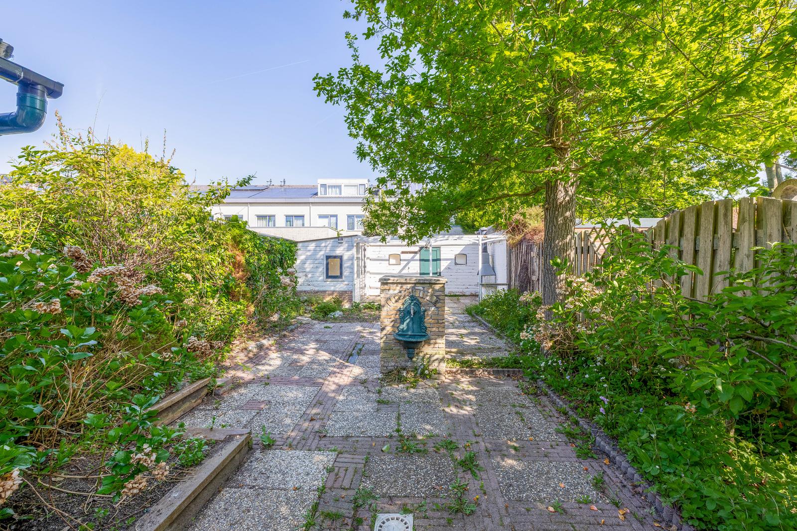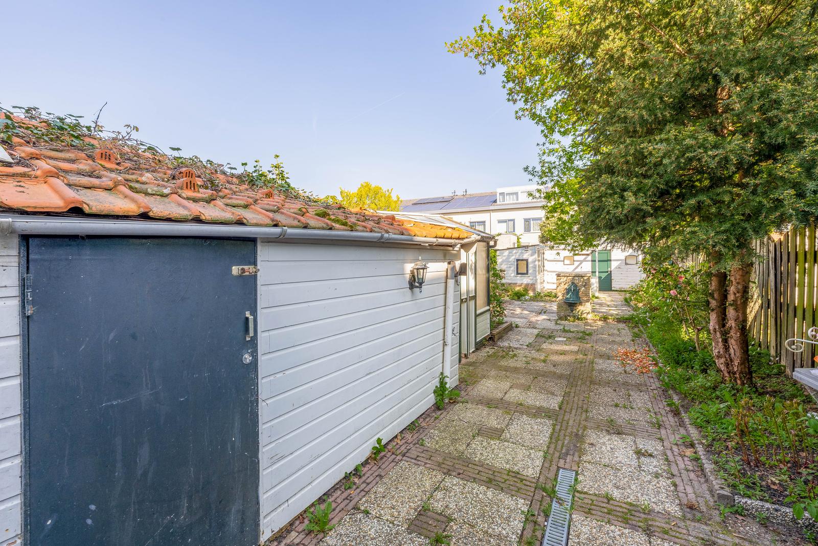 Paar treden naar de schitterend diepe achtertuin met toegang tot de berging en schuur. U kunt de tuin ook betreden d.m.v de tuindeur achterom.