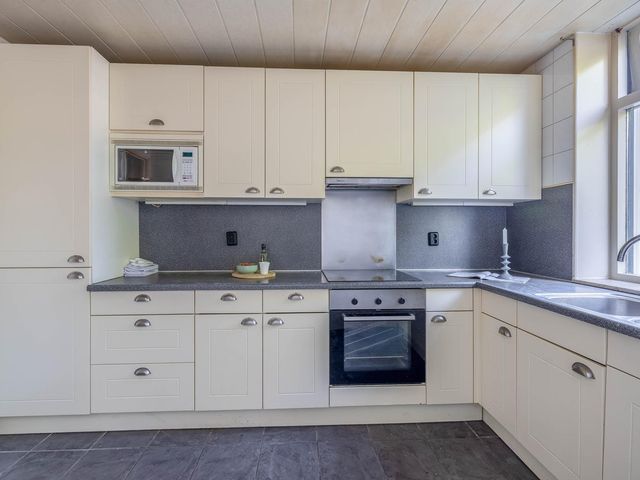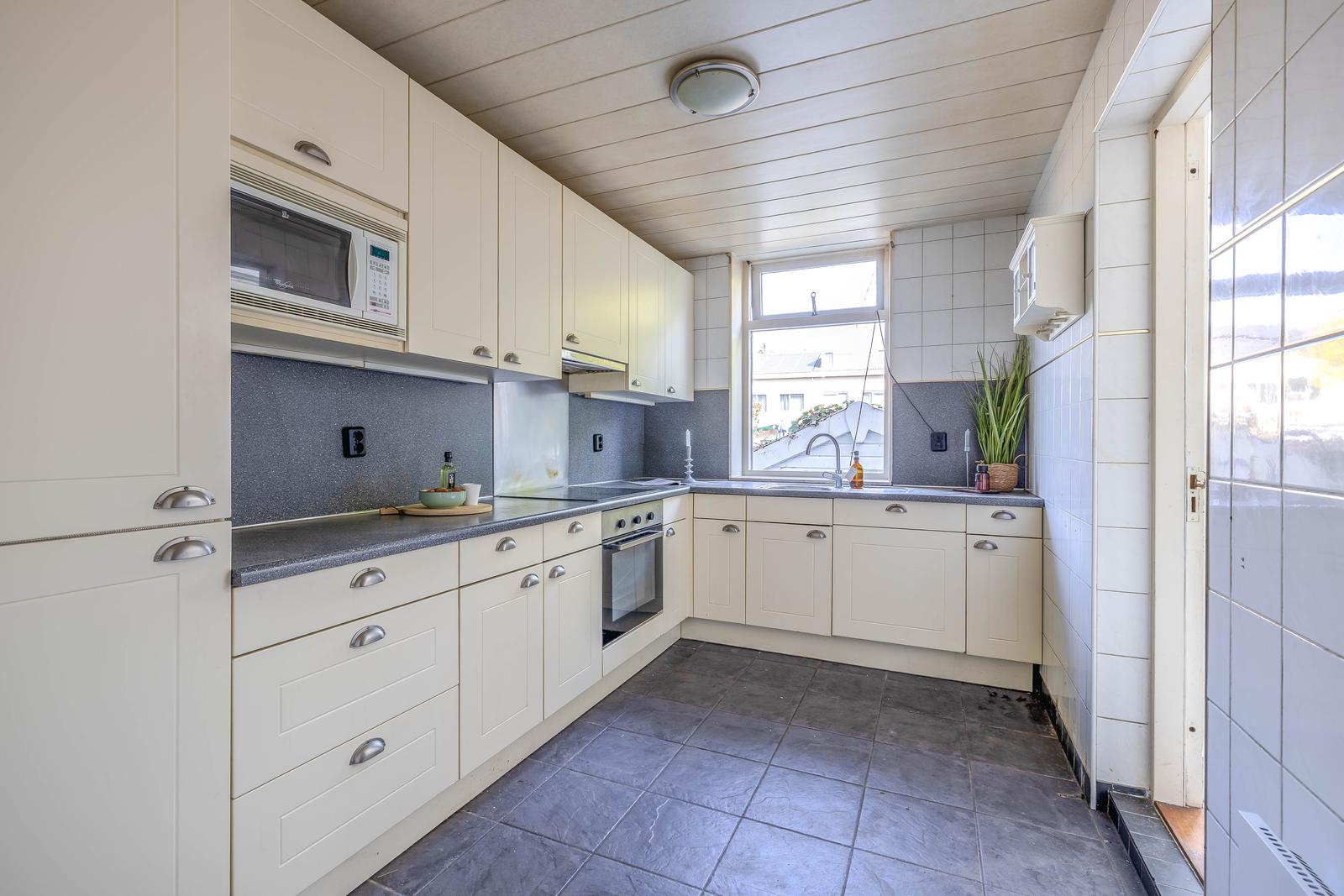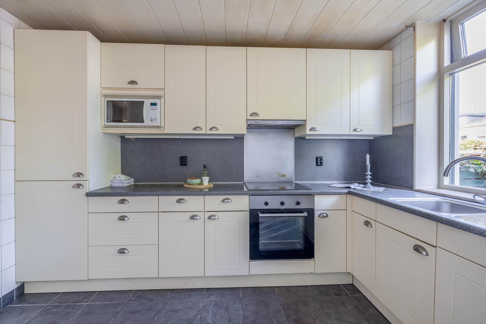 Eenvoudige maar nog nette keuken met toegang en tot de achtertuin.