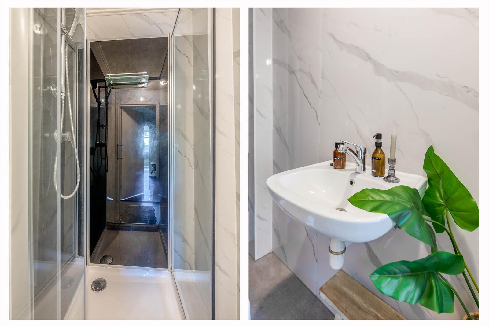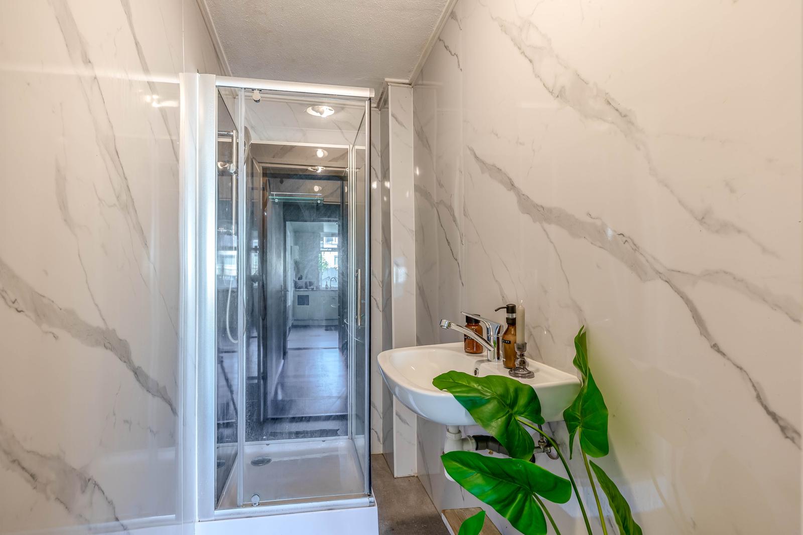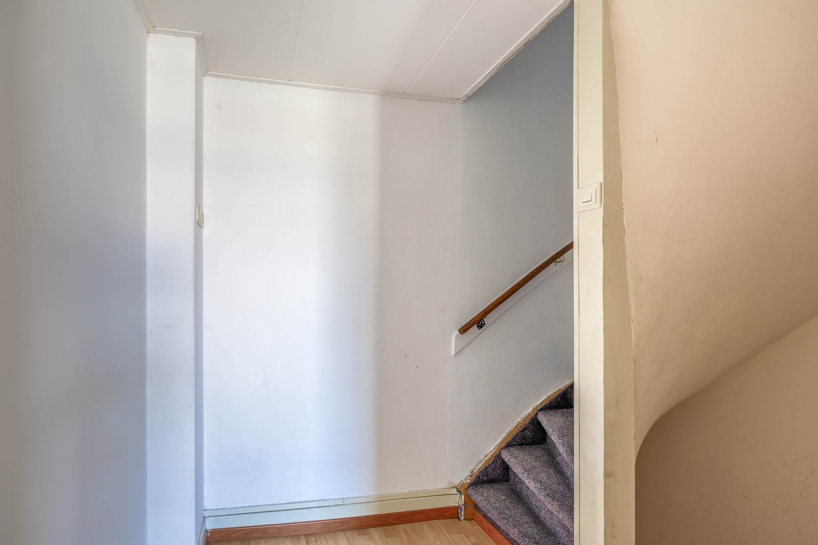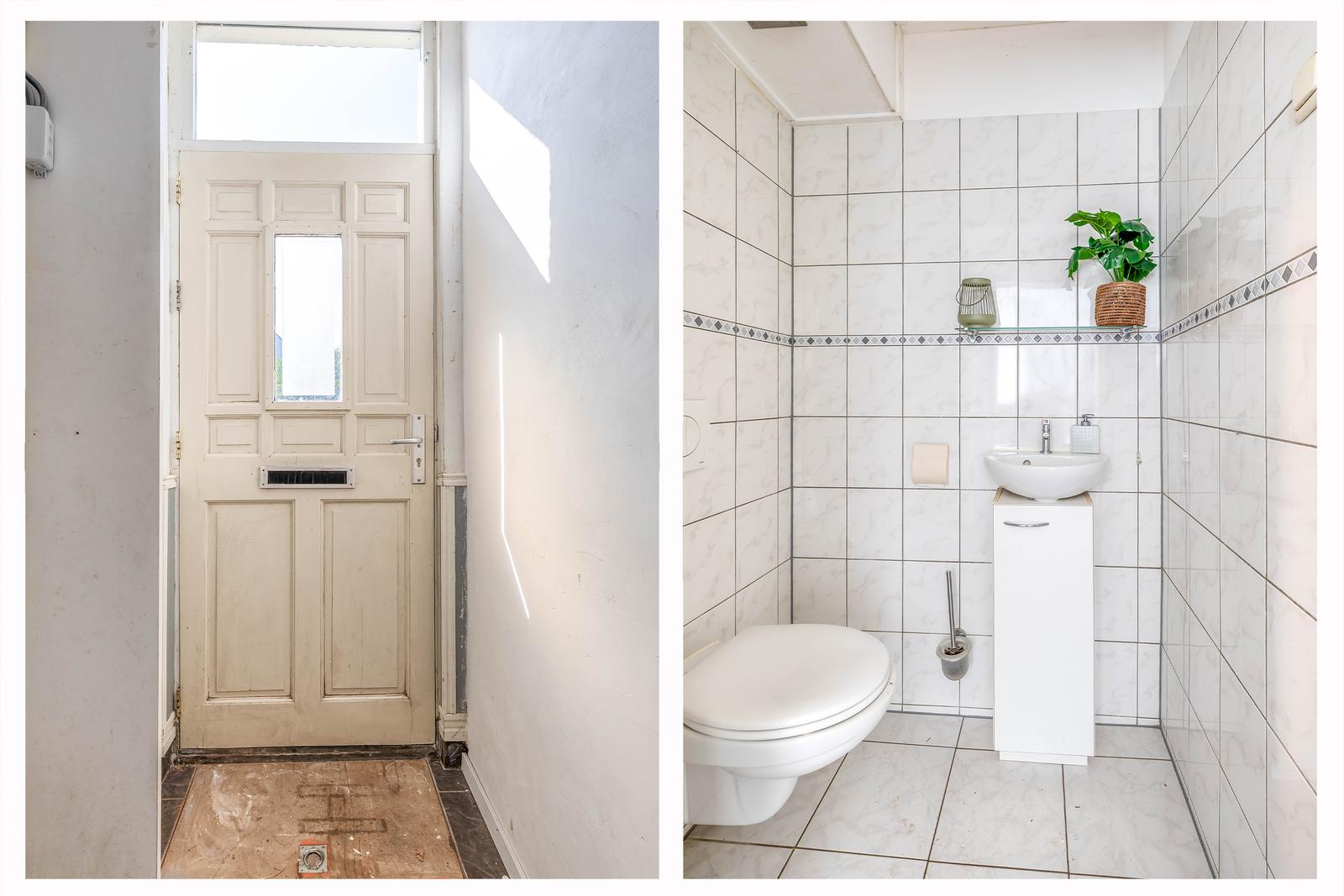voortuin, entree van de woning in een lange gang met trapkast, toilet, de douche met wastafel onder de trap naar de slaapkamers op de verdiepingen.