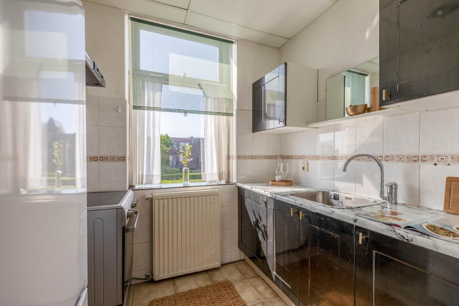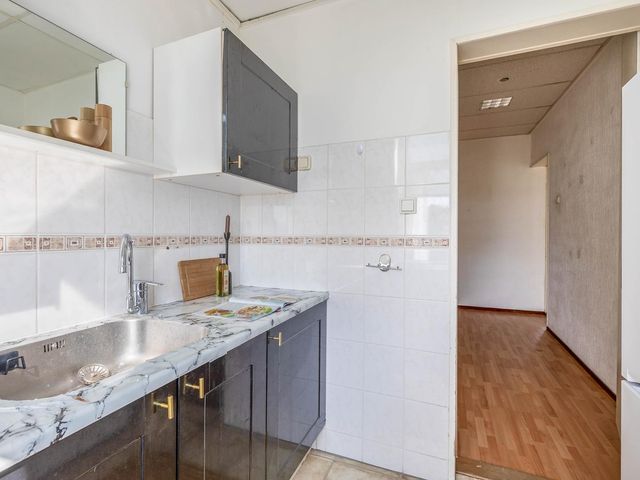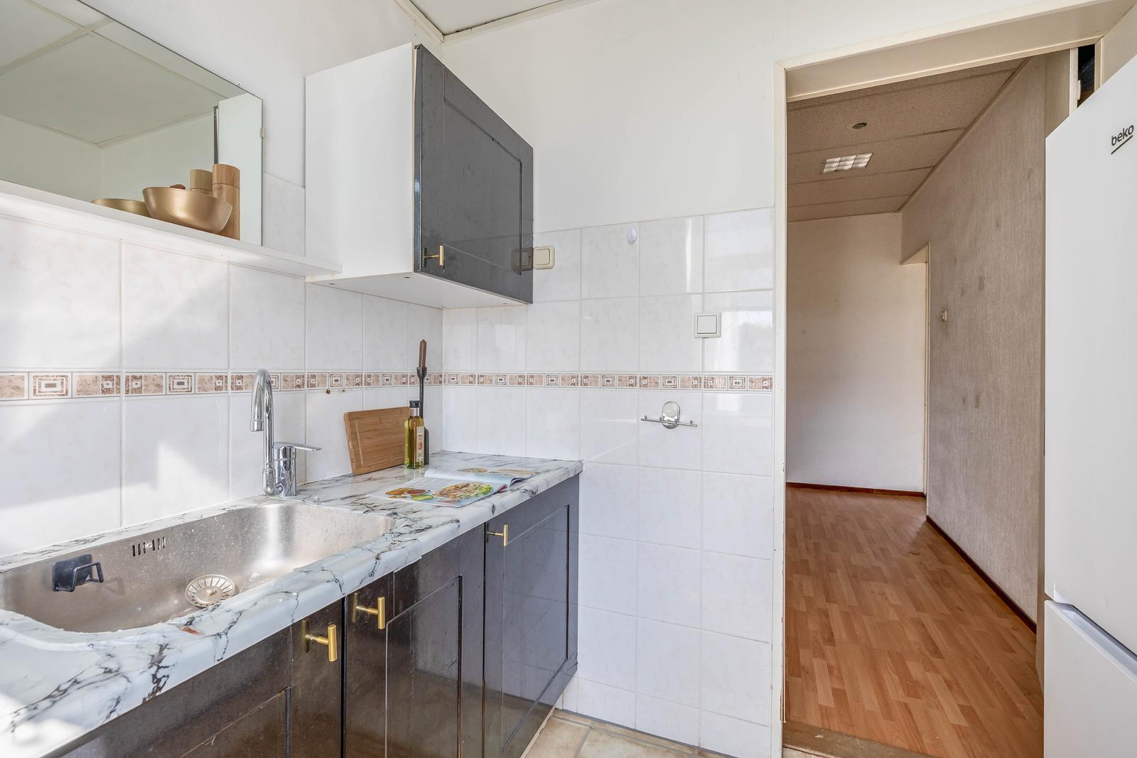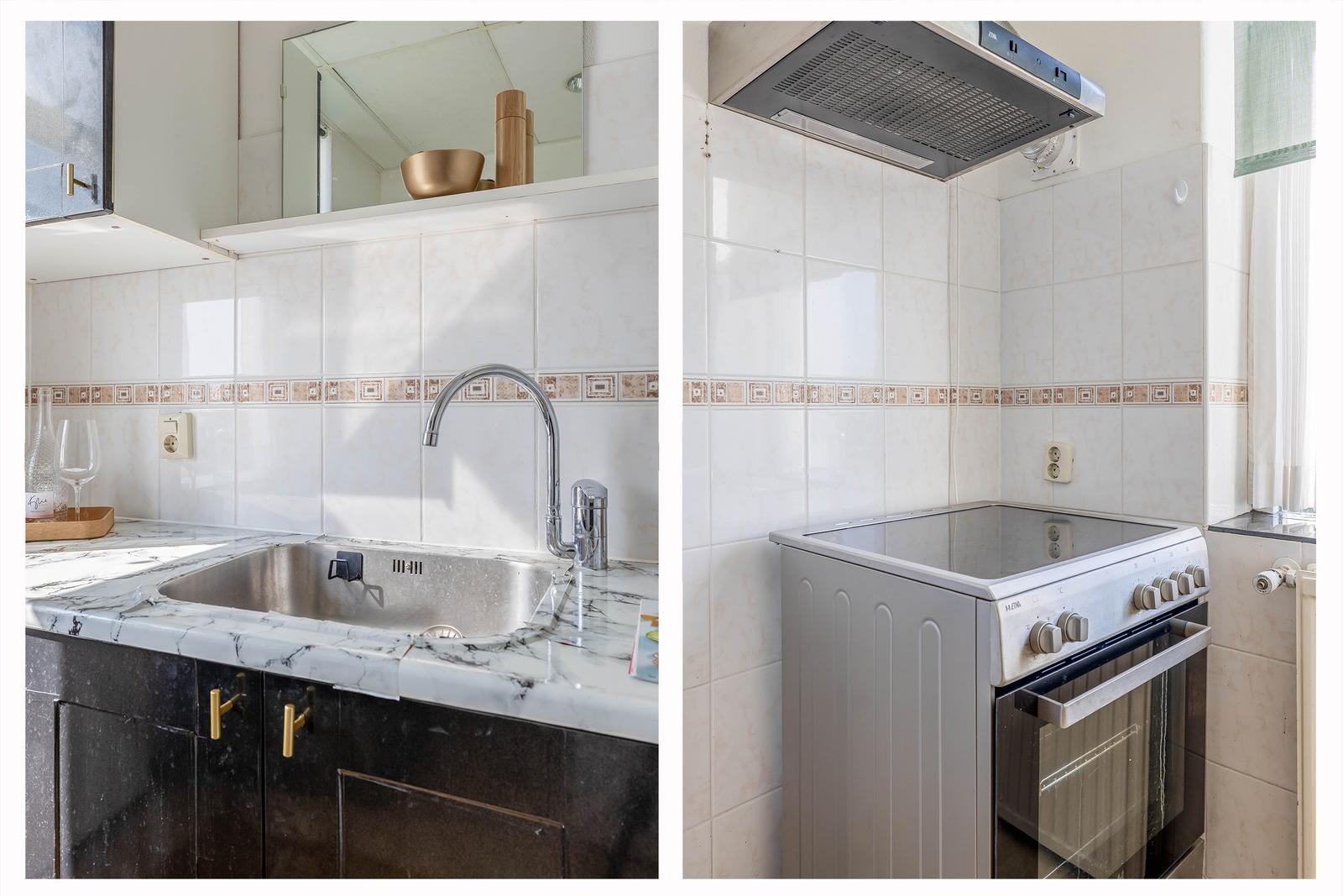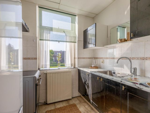 Aan de voorzijde ligt de eenvoudige keuken welke u door middel van het doorbreken van de muur bij de woonkamer zou kunnen betrekken.