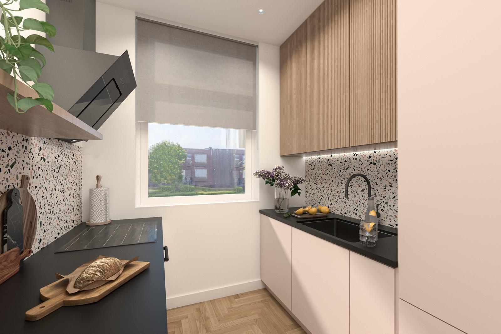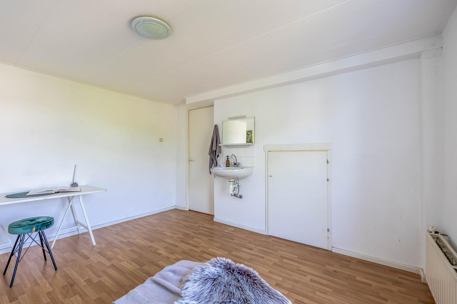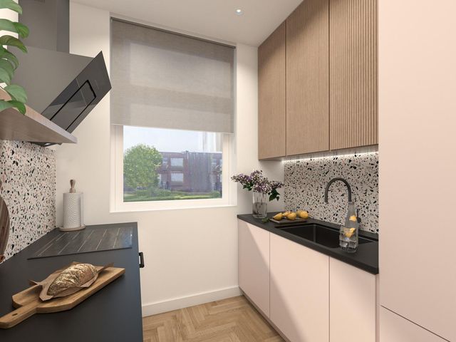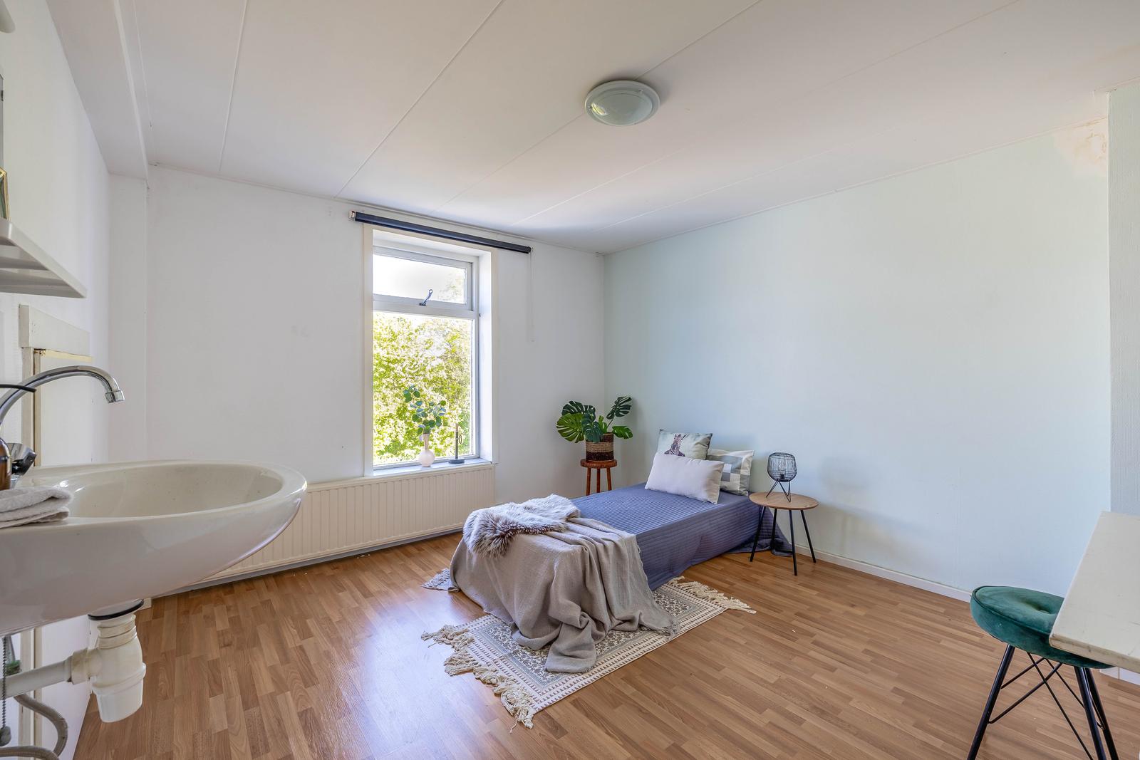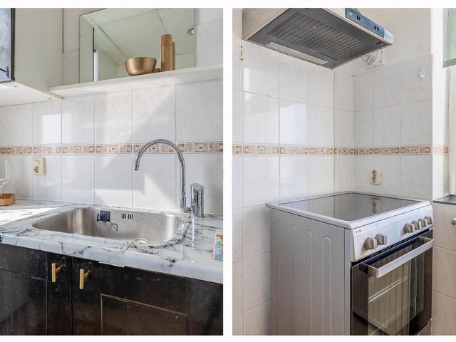 Aan de voorzijde ligt de eenvoudige keuken welke u door middel van het doorbreken van de muur bij de woonkamer zou kunnen betrekken.
