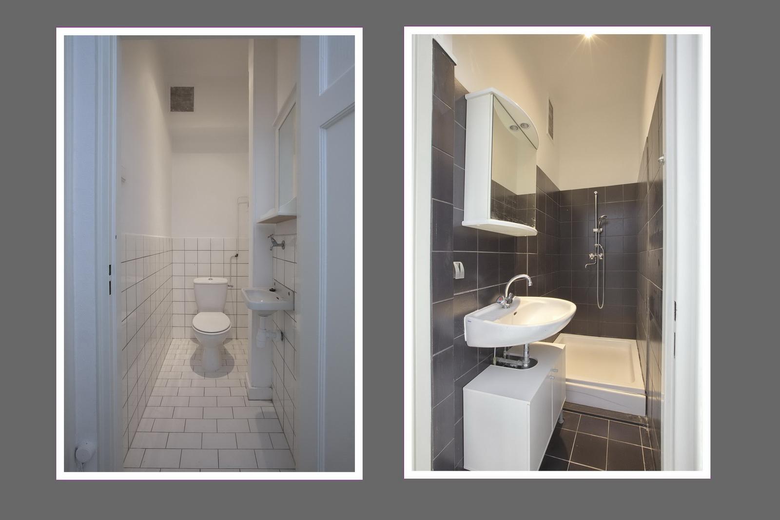 Toilet met fonteintje, badkamer met douche en wastafel. Boven de badkamer bevind een ruimte welke als een kleine opslag gebruikt kan worden.
