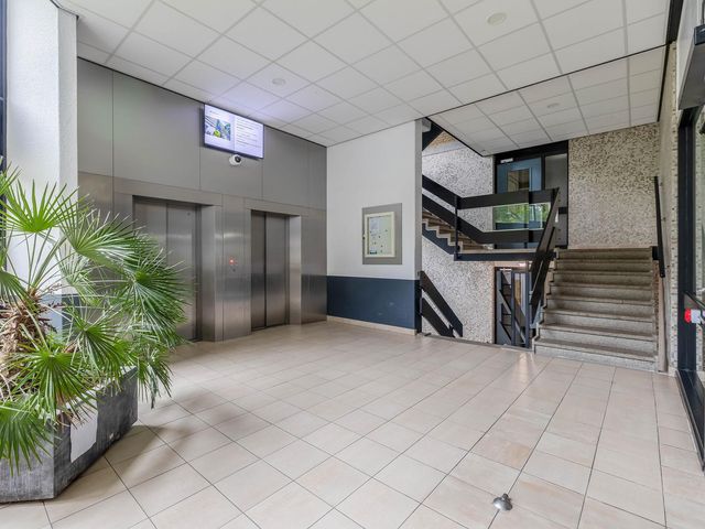 Neatly maintained central entrance with doorbells and mailboxes, intercom, door to a secure entrance with two elevators, staircase to the upper floors, access to the storage room, communal bicycle storage, and underground parking garage.
