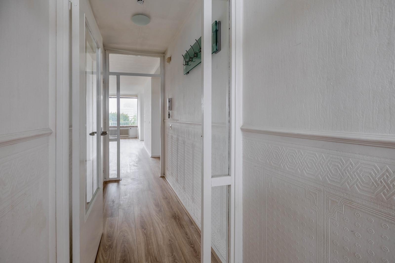 Entree, tochtportaal naar hal met meterkast, intercom, doorgang naar keuken en woonkamer. De royale lichte woonkamer is voorzien van een nette laminaatvloer, grote raampartij, balkon met vrij uitzicht. Breed balkon met zeembalkon en fraai uitzicht over groen en water.