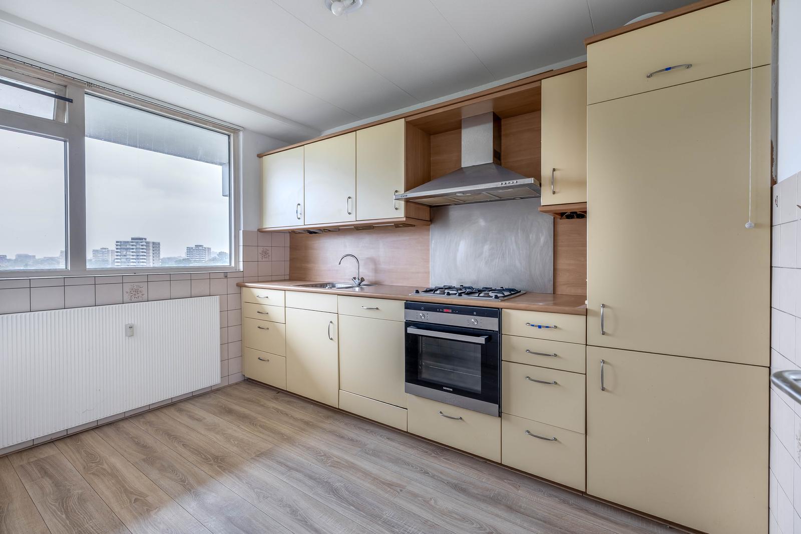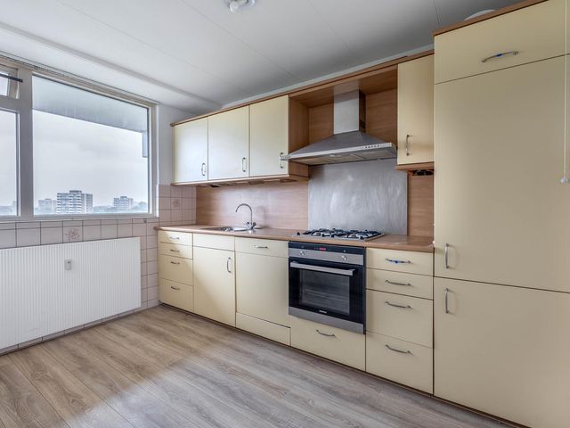 Located on the eighth floor of the well-maintained "Oranjestein" apartment building in the Driemanspolder district, you'll find this surprisingly spacious and practically laid-out five-room apartment with a sunny west-facing balcony and a private storage unit in the basement. This well-maintained apartment features a spacious kitchen with built-in appliances, a modern bathroom, a separate toilet, and four spacious bedrooms. The complex is located close to the city center, the "De Vijverhoek" shopping center, schools, Vernedepark and Arianepark, public transport (Delftsewallen, Driemanspolder, and Zoetermeer train stations, various bus stops), and major roads (A12).
