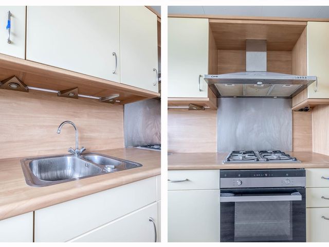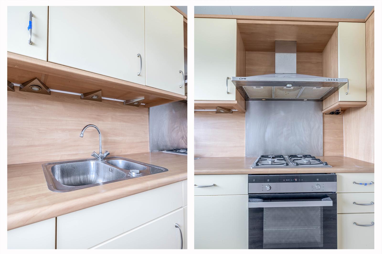 De keuken is voorzien van 5-pits gaskookplaat, afzuigkap, koel/vriescombinatie, keukenkabinet en aanrecht met voldoende werkruimte.