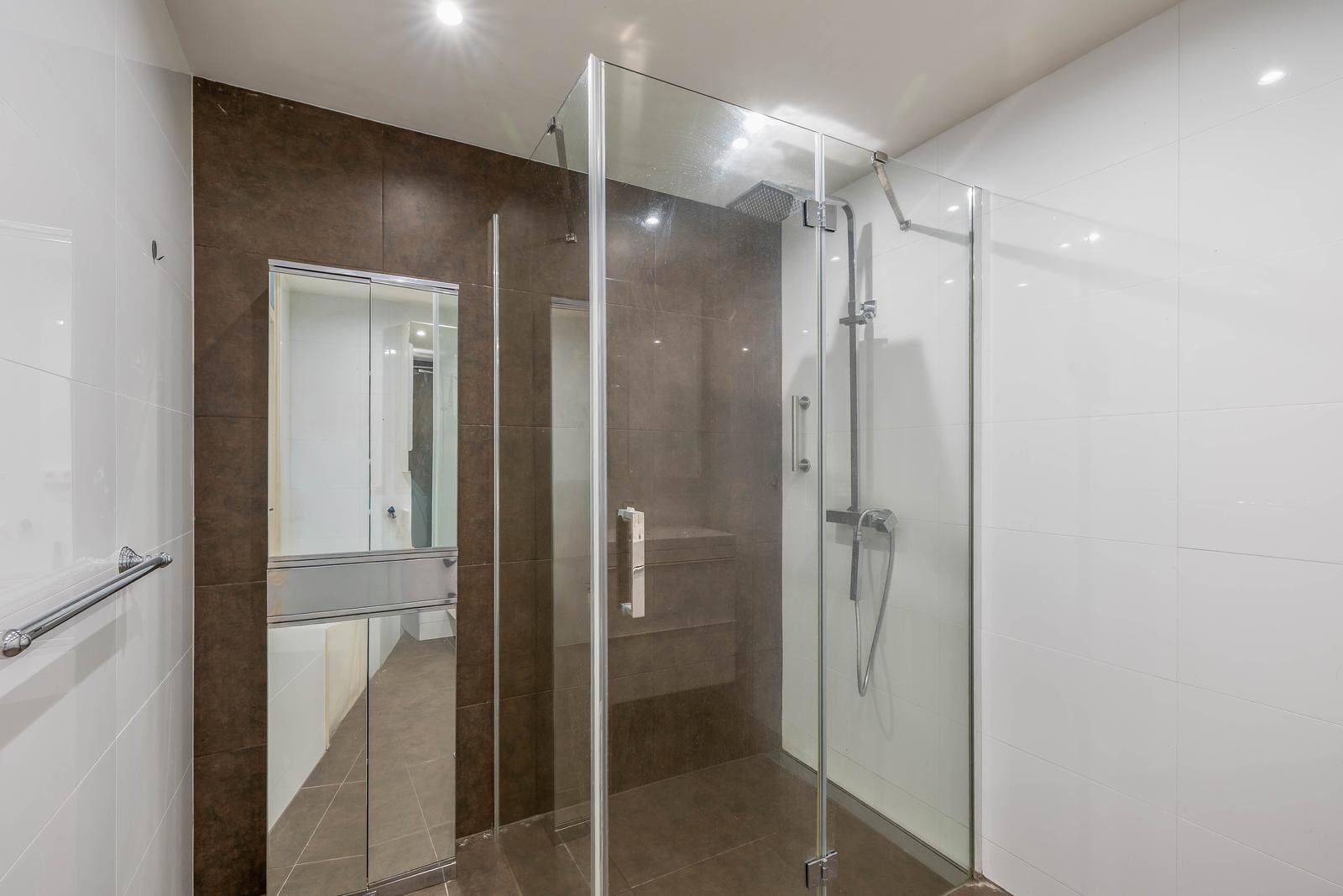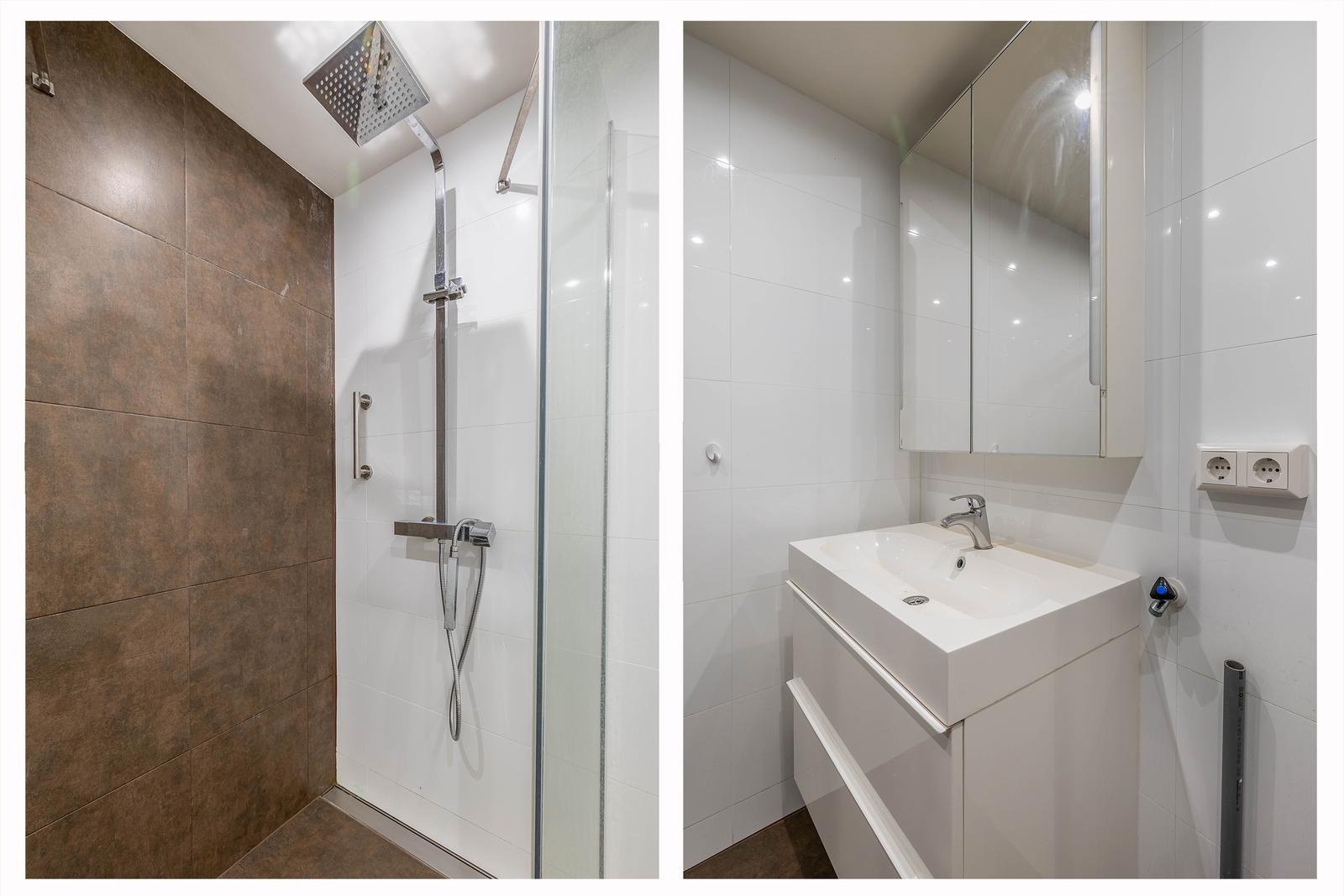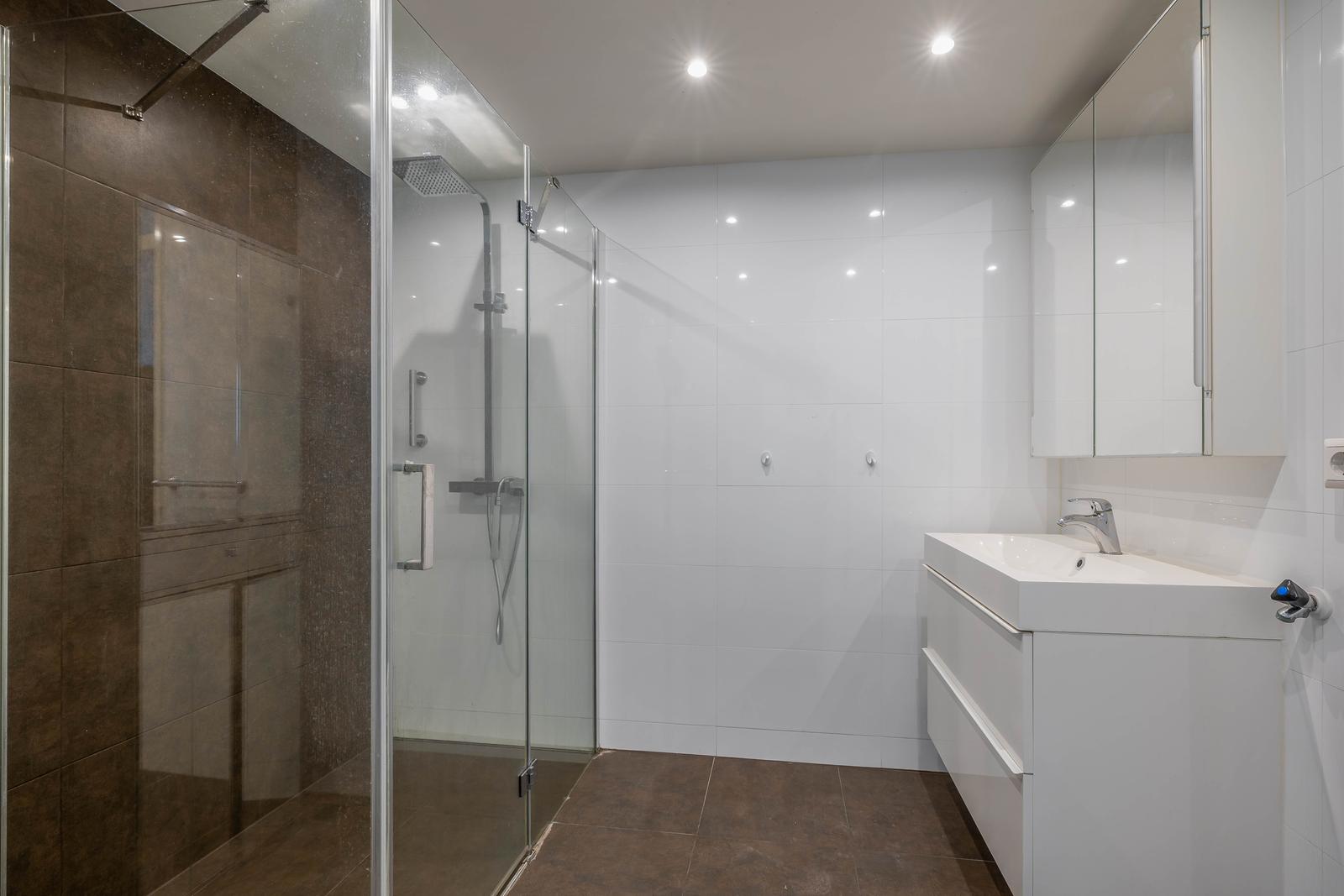 Volledig betegelde moderne badkamer met aparte douche, hardglazen douchedeuren, wastafel met onderkast en spiegel, en tevens de wasmachine aansluiting.