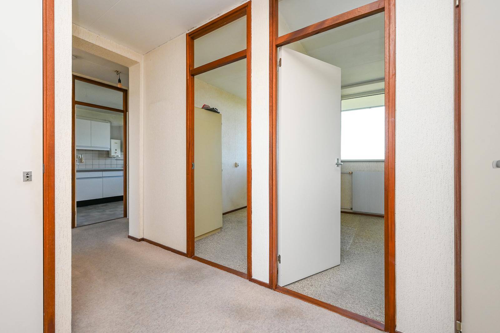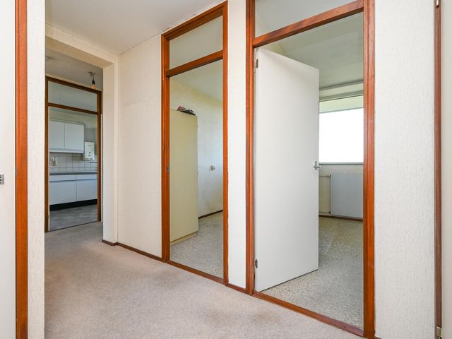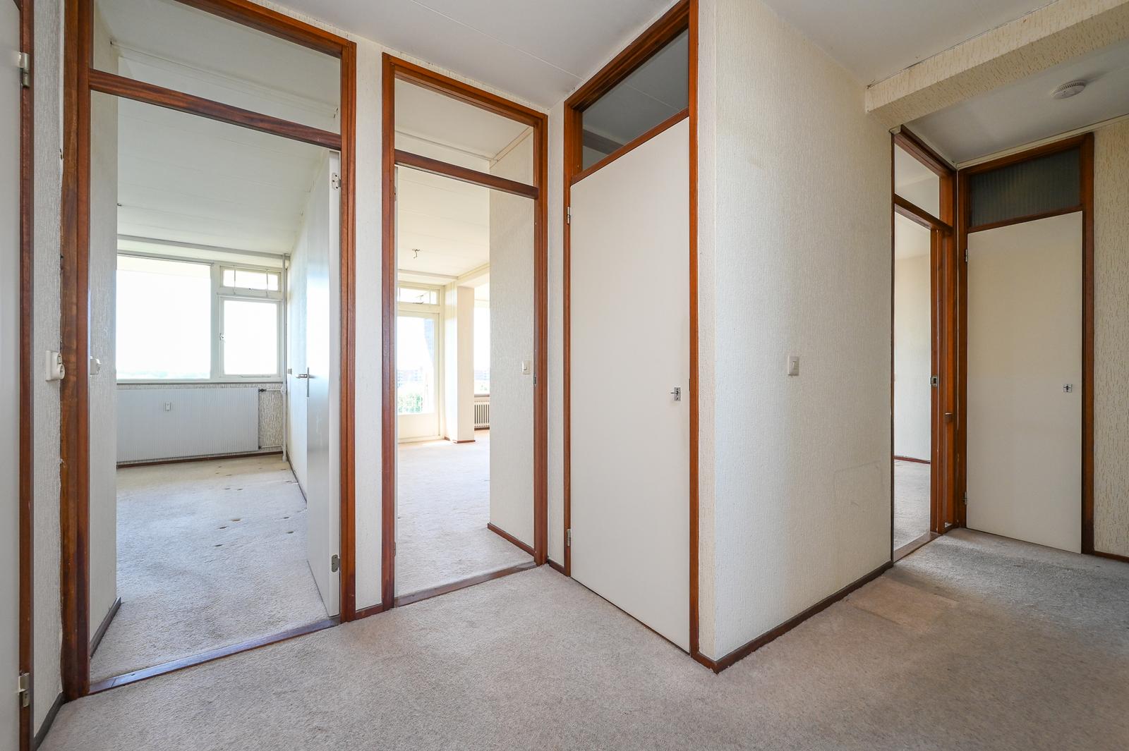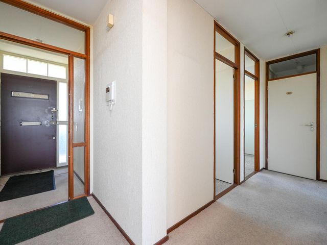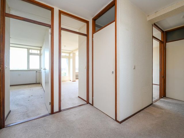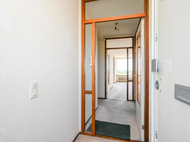 Entree appartement; hal met tochtdeur. Ruime keuken, Zeer lichte woonkamer met een fijn vrij uitzicht. Zijkamer met toegang tot het ruime balkon welke is gelegen op het zonnige zuidwesten. Vanuit de hal heeft u toegang tot de bergkast, de aan achterzijde gelegen slaapkamer en de twee aan de voorzijde gelegen slaapkamers. Separaat toilet. De ruime badkamer kunt u indelen naar eigen wens.