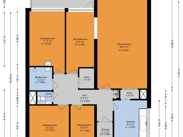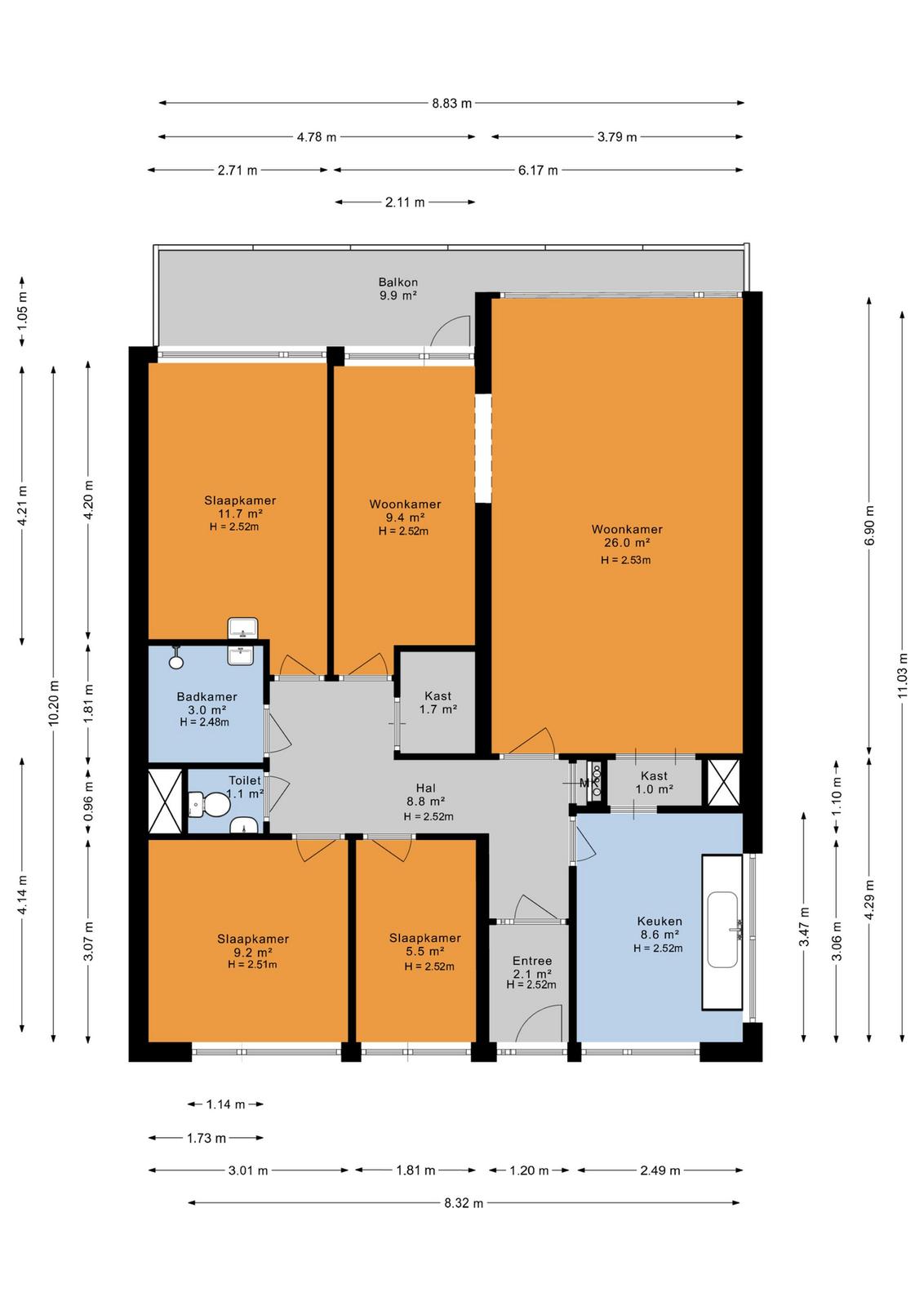Apartment entrance; hall with draft door. Spacious kitchen, Very bright living room with a nice unobstructed view. Side room with access to the spacious balcony which is located on the sunny southwest. From the hall you have access to the storage cupboard, the bedroom at the rear and the two bedrooms at the front. Separate toilet. You can arrange the spacious bathroom according to your own wishes.