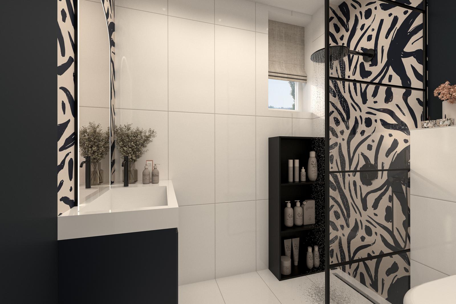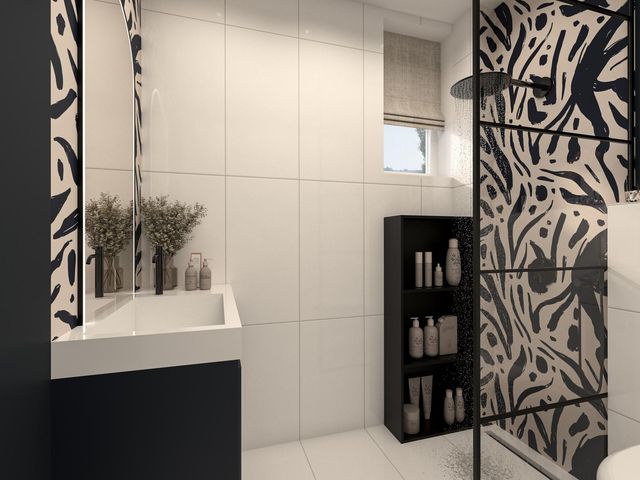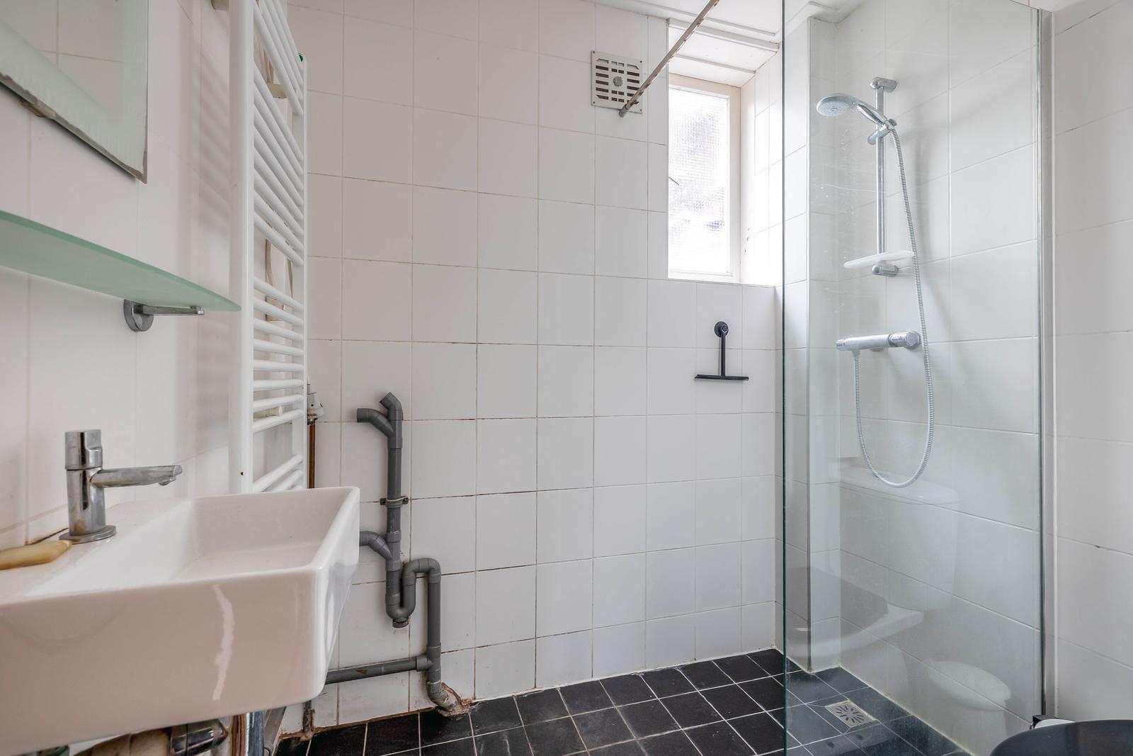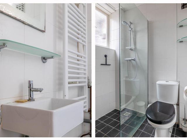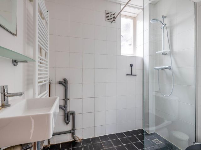 De badkamer heeft wat aandacht nodig, maar is betegeld, heeft een wastafel, douche en toilet.